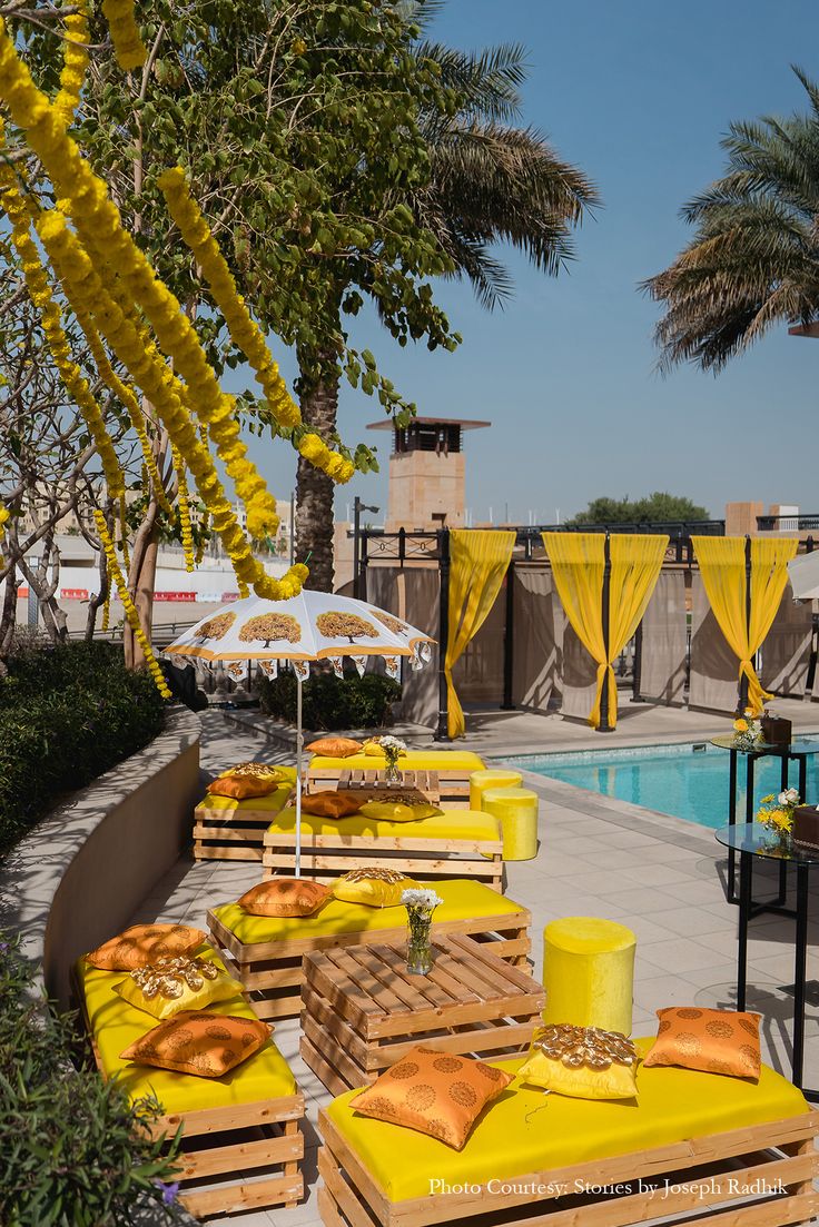 The ceremony takes place at their respective homes in the presence of loved ones. Turmeric is considered to have purifying and beautifying properties, and this ritual is believed to bless the couple with good health, glowing skin, and protection from evil eyes as they step into a new phase of life.